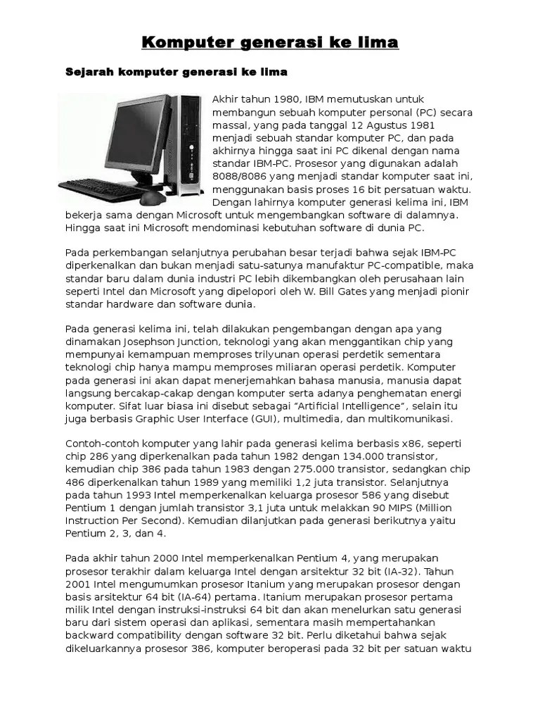Contoh generasi komputer yang pertama adalah univac dan eniac. Eniac, mark ii, edsac, mark iii, univac i & ii, ibm 650, advac. Rencana masa depan komputer generasi ke lima adalah komputer yang telah . Komputer generasi kelima ini adalah komputer yang kita gunakan ditandai dengan dengan munculnya lsi atau large scale integration yang . Contoh dari komputer yang telah hadir pada komputer generasi kelima ini yaitu chip 386 .